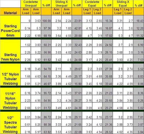 Материал для блокировочных петель. В качестве блокировочных петель возможно применение тонкой динамической веревки, репшнуров из нейлона и высокопрочных материалов, сшитых петель из нейлоновых строп разной ширины, петель из высокопрочных материалов типа динемы, динекса и т.п. Наиболее безопасным является использование динамической нейлоновой веревки или репшнура. Даже статический 7мм нейлоновый репшнур имеет большую эластичность по сравнению с петлями из высокопрочных материалов. Сравнение некоторых характеристик материалов для блокировки точек станции приводится в статье Тома Мойера «Тестирование высокопрочных шнуров» [32]. Наиболее опасным является использование сочетания блокировки станции и самостраховки из неупругих материалов типа динемы, спектры и т.п. По результатам испытаний самостраховок [33], жесткость динемовых петель соответствует веревке, показывающей усилие рывка около 22 кН по стандартному тесту УИАА! При этом даже срыв на малую глубину, например, при оседании станции на компенсационной петле из-за отказа одной из точек, приводит к большим перегрузкам станции. Уже при факторе рывка 0,5 нагрузка на станцию достигает 12 кН. Возлагать большие надежды на упругость человеческого тела не стоит – по данным испытаний фирмы Gravitec Systems Inc, разница в нагрузках при падении человека и стальной болванки составляет, в среднем, 10%. [34].