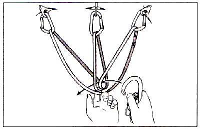 Другой вариант – завязать узел примерно посредине длинной петли, вщелкнуть концы петли, разделенные узлом, в карабины точек и присоединить карабин центрального пункта, как показано на рис. 23.