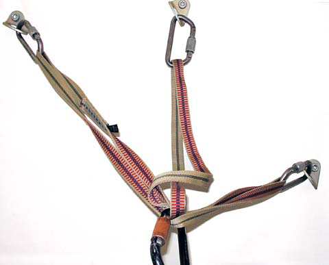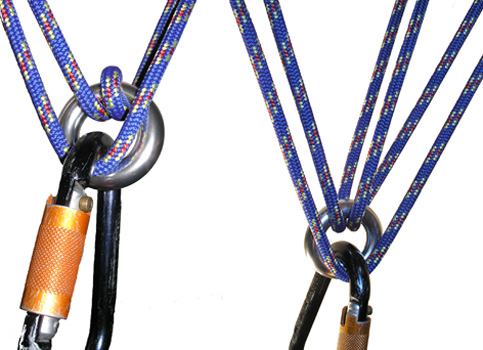 Рис. 4 - мы использовали более длинную петлю и получили меньший угол между ее ветвями и распределение нагрузки на четыре нити петли. Идеальный угол в этой ситуации –около 25 градусов. Это уменьшает нагрузку на петлю и карабин, а также снижает вероятность нагрузить карабин в трех направлениях. Для дальнейшего уменьшения риска неправильной нагрузки, использован специальный карабин.