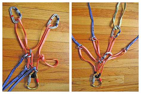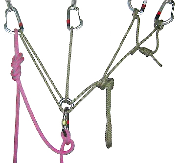 Самая нижняя точка имеет маленькую удлиняющую петлю, так как длины желтого репшнура не хватило для хорошего объединения точек. Карабин на синей петле имеет ту же проблему что и на точке слева!