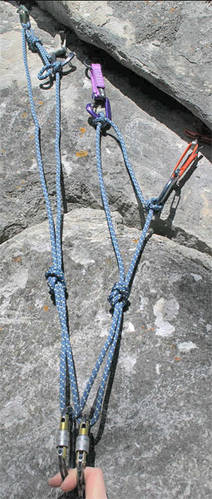 На рис. 68 - смешанная конфигурация с использованием стропы. Левая ветвь петли объединяет две точки последовательно, на закладку справа идет отдельная ветвь. Узел в правой петле нажимает на карабин. Этого надо избегать!