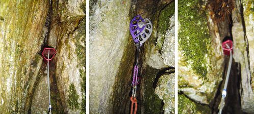 Иногда, естественные особенности скалы позволяют продеть петлю через естественное отверстие или туннель, чтобы обеспечить пункт страховки. В этом случае справедливы сделанные выше рекомендации в отношении материала петель, необходимости испытания надежности и опасности острых кромок. Показанная на этой рис. 12 точка, непригодна в качестве единственной для станции, но может использоваться как часть многоточечной системы для организации надежной станции.