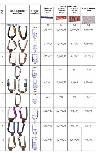 Таблица 1. Статический коэффициент трения петли в карабине точки страховки.