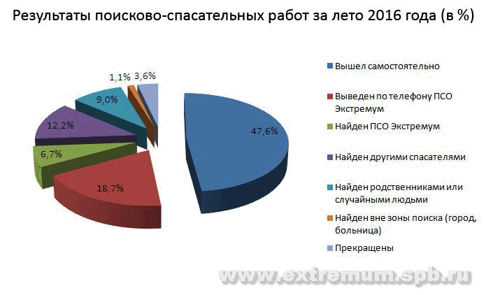 Почти половина потерявшихся (47%) выходили к цивилизации самостоятельно. В 163 случаях (25,4%) люди были найдены благодаря помощи дежурных руководителей спасработ “Экстремум” по телефону или поисковыми группами отряда. 12% потерявшихся найдены благодаря усилиями спасателей других формирований, 9% помогли родственники или случайно встреченные в лесу люди. 7 раз (1,1%) люди были найдены вне зоны поиска, по 23 заявкам (3,6%) работы были прекращены — в каких-то случаях не было подтверждения данных об уходе в лес, где-то — по сроку давности.