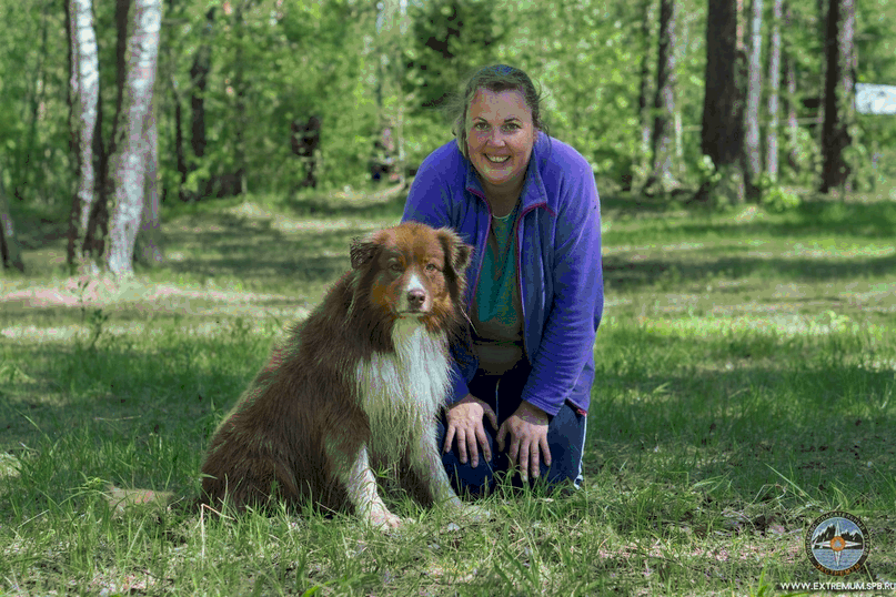 В один из дней я была напарницей Кати Цветковой при прохождении ежегодной аттестации ее собаки. Катин песик – австралийская овчарка по кличке Мач. Добрый, неторопливый, сообразительный собакен. Задача: найти статиста в заданном квадрате максимум за 6 часов. Лес нам достался не очень хороший. Сначала переправа через речку, затем овраг с поваленными деревьями и болотом, бурелом, крутые склоны, опять болото, опять бесконечные поваленные деревья – всё было в нашем с Катей распоряжении. Шли галсами. Шли медленно. 1 километр в час. Мач рядом, но видно, что сосредоточен и включён в работу. Статиста Мач нашёл в болоте, спустя 3 часа после того, как мы вышли. Молодчина!