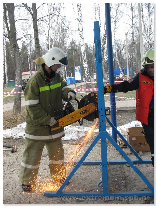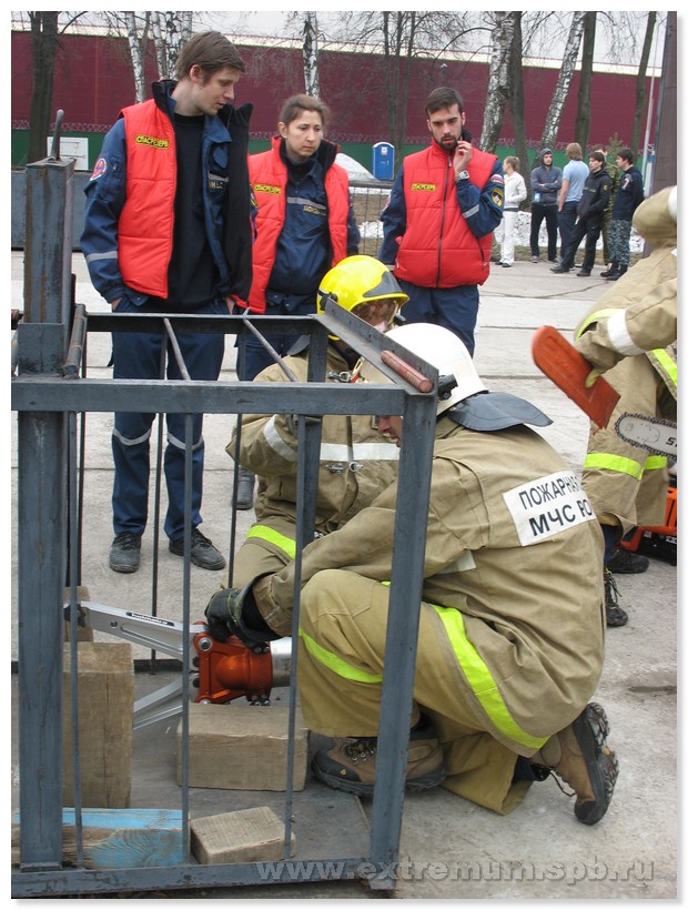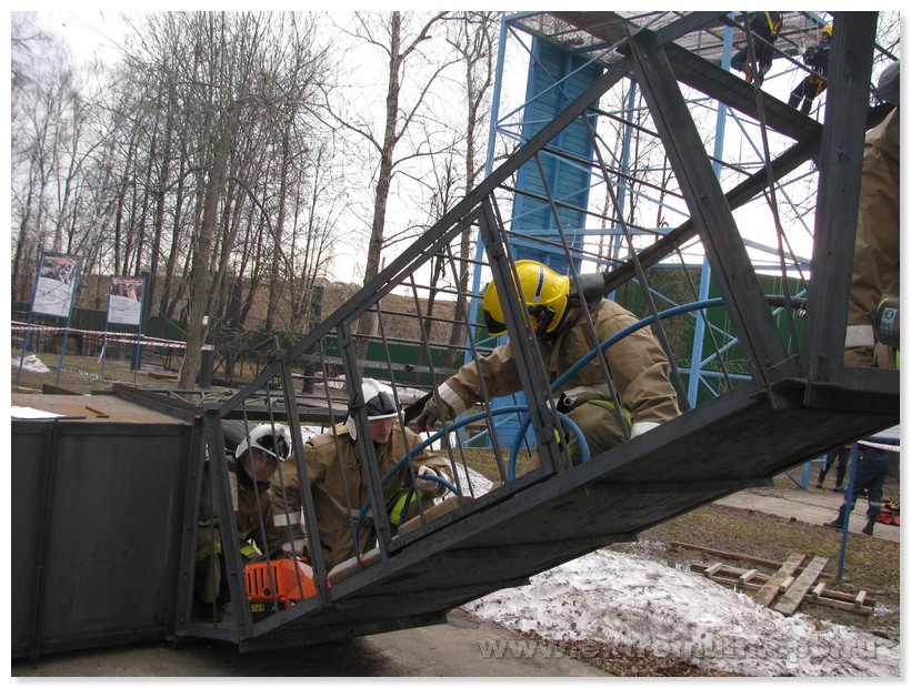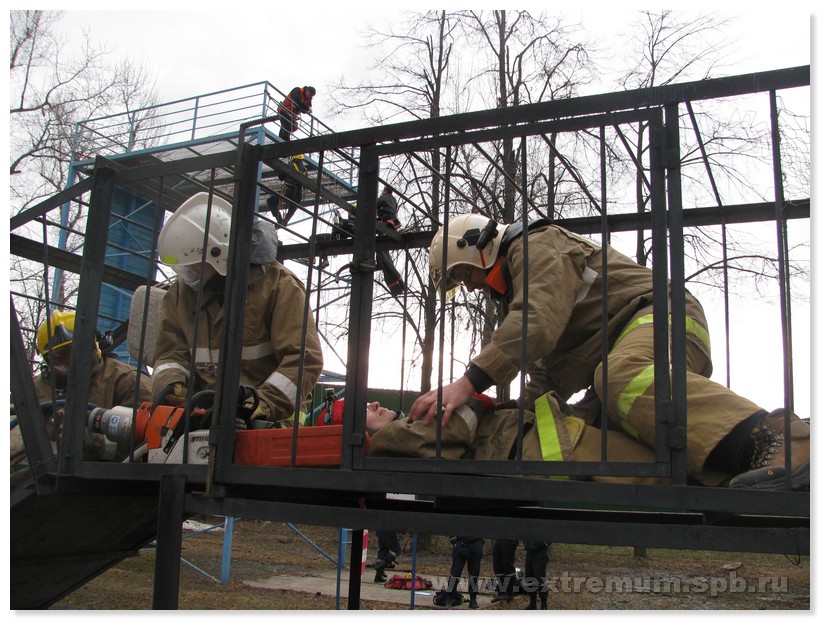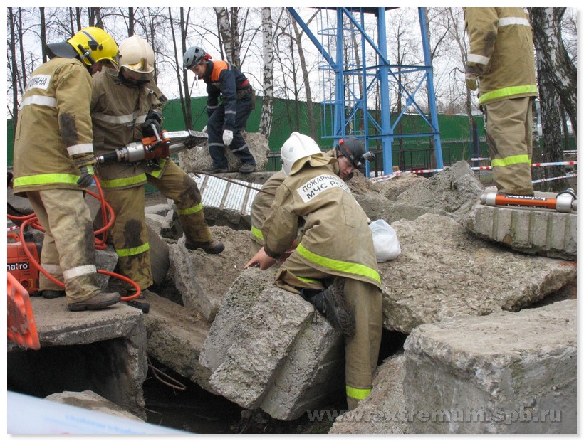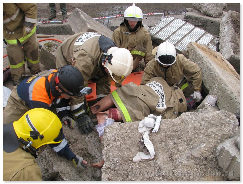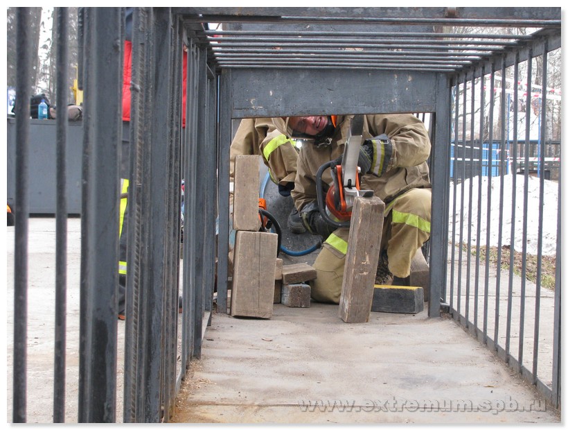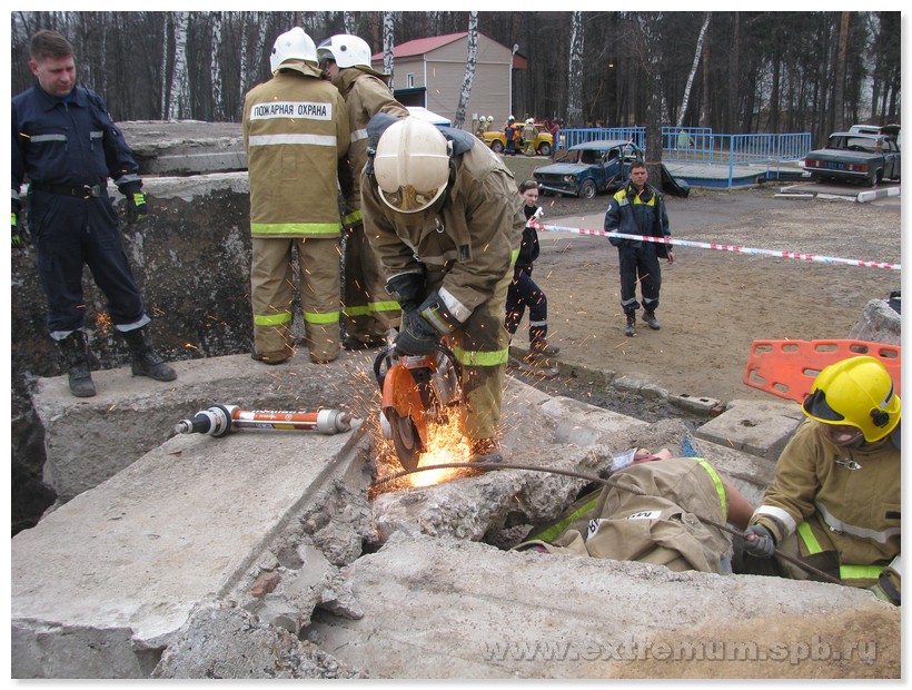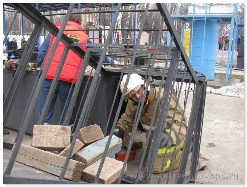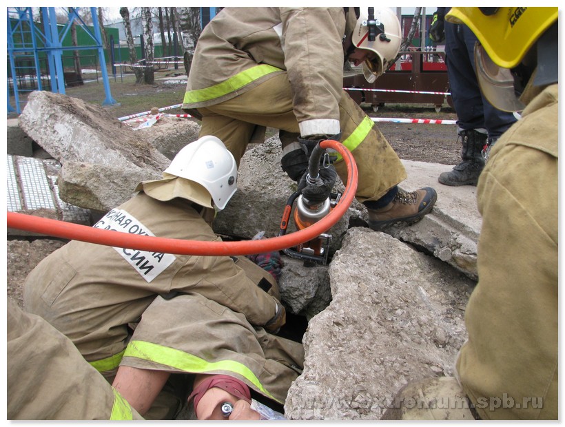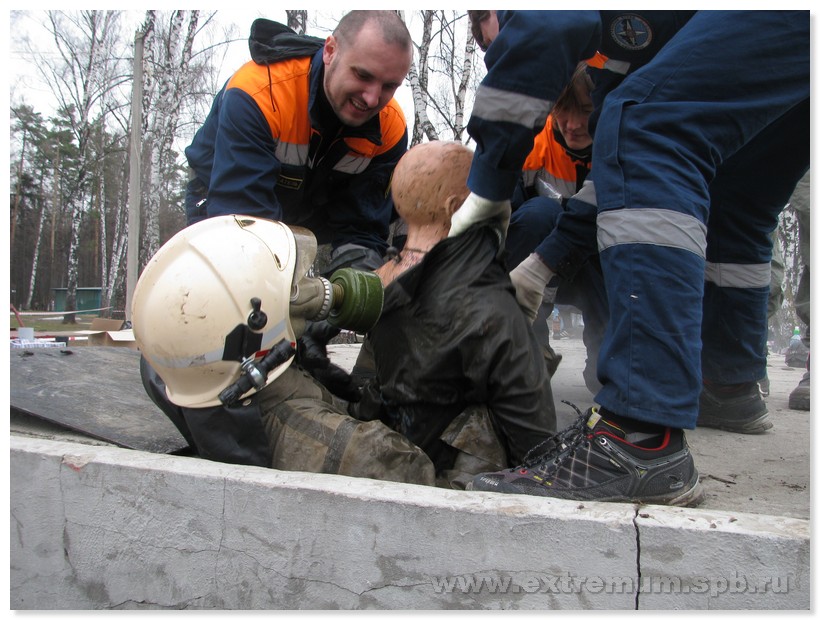 Нужно было проникнуть на территорию обрушения через щель, попутно ликвидировав на входе открытое горение с помощью огнетушителей, найти и деблокировать пострадавшего, а затем вытащить его, найдя для этого путь. У пострадавшего, роль которого, разумеется, выполнял манекен, оказались зажатыми (под разными плитами) вся нога ниже колена и кисть. По легенде с момента обрушения прошло уже больше 2 часов. Для освобождения нужно было сначала перепилить арматуру бензорезом, затем гидравликой поднять плиты, придавившие пострадавшего.