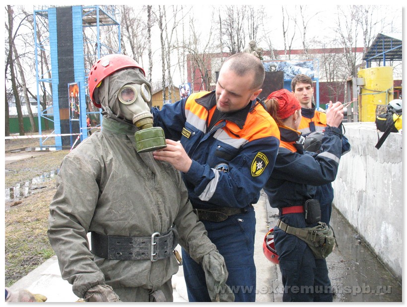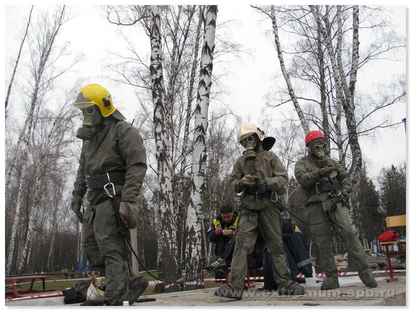 По легенде, произошла утечка аварийно химически опасного вещества из цистерны, и группе из 4 человек необходимо зайти в зону и ликвидировать пробоину с помощью рем.комплекта из заплатки, строп и трещоток. Работали в противогазах и легких костюмах Л-1, заходить в зону надо было через специальный "шлюз". Еще на старте, увидев в куче выданного снаряжения мягкие носилки, сразу заподозрили, что "это жжжж неспроста". Так и оказалось - после того, как ликвидировали указанную течь и собрались выходить, судья хлопнул идущего последним бойца по плечу и показал ему "ложись, тебе плохо". Предполагалось, что звено выйдет в тамбур, не заметив отсутствия замыкающего. На уловку не поддались, заметили падение замыкающего сразу же, как сказал судья - "Эх, много головой крутят!". Подняли, вынесли наверх через шлюз. Здесь один из спасателей снял противогаз, неверно расслышав фразу судьи "противогазы не снимать" и автоматически сразу же тоже стал "пострадавшим". Вынесли в безопасную зону первого, вернулись и вытащили второго.