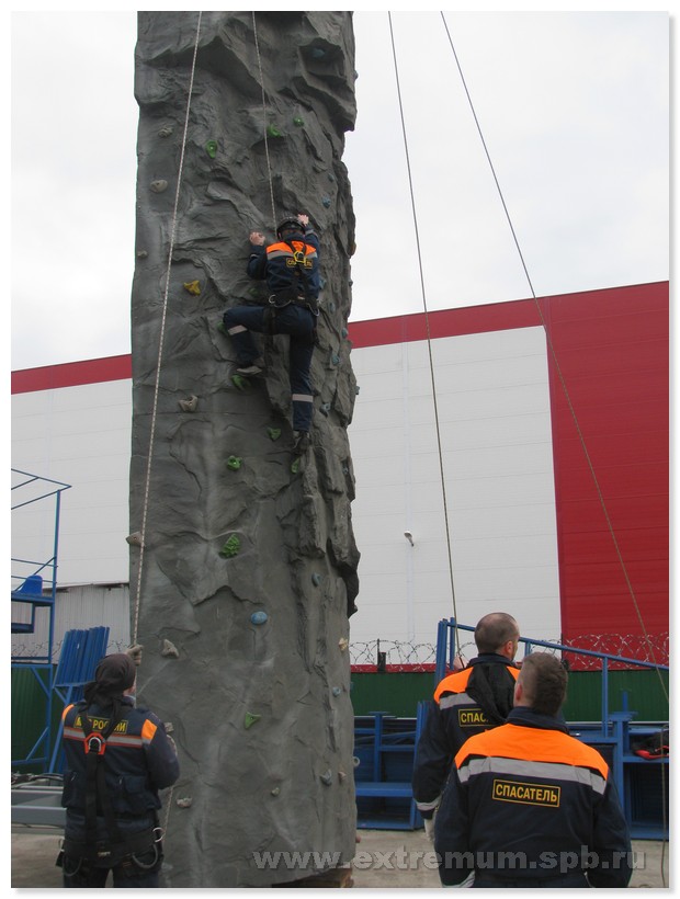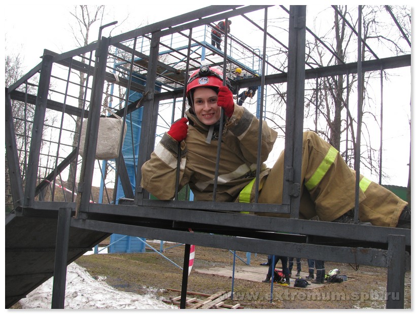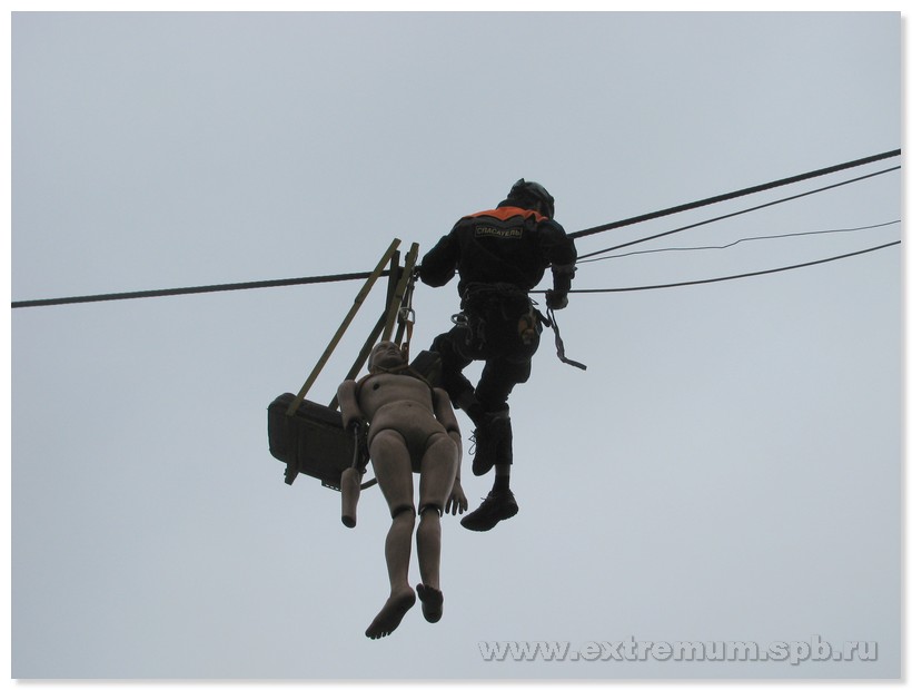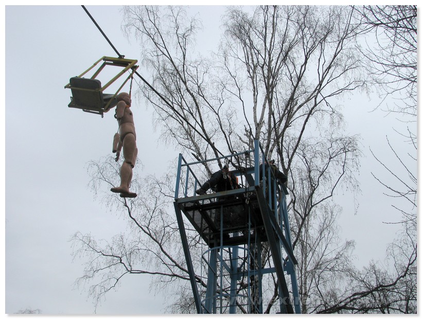 Этап заключался в эвакуации зависшего в стропах после аварии на подъемнике лыжника. Т.к. "лыжник" висел прямо под тросом, а рядом была башня с лестницей, по которой можно было подняться, весь этап свелся к подходу одного человека к пострадавшему, перестегиванию его на веревку и спуск вниз по прямой без сопровождения. Времени он занял у нас минут 5-10. Узнав, что это была "сложная" высотка (еще был этап простой, где надо было жумариться на башню и спускаться с нее вниз), поняли, что альп.снарягу мы притащили все-таки, наверное, зря. Зато потом мы бродили по полигону, весело звеня карабинами и перешучиваясь, что было бы, если бы решили приезжать не "налегке", как в этот раз, а с полным комплектом снаряжения.