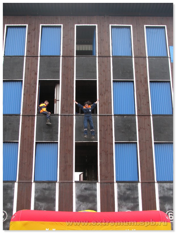 Попрыгали с третьего этажа. Было сначала стремно, потом весело. Единственное, что части команды так и осталось непонятным - как же все-таки надо правильно отталкиваться, чтобы падать на куб правильно - не ногами, а спиной вниз? По идее, это средство, предназначенное для спасения неподготовленных людей, и не должно предполагать какую-то сложную технику прыжка, но тем не менее, в падении не так уж просто повернуться правильным образом, а если попадаешь в него сначала ногами, позвоночник испытывает серьезную и, можно сказать, даже весьма неприятную нагрузку.