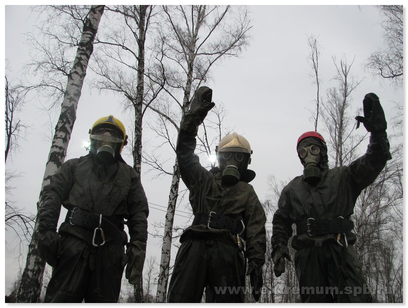 Звено (3 человека) все в тех же Л-1+ противогаз в связке спускаются в задымленное помещение с угрозой обрушения конструкций, находят там пострадавшего (манекен 90 кг) и эвакуируют. Поползали, нашли, вытащили. Понравилась реально нулевая видимость (хотя дым был светлый, театральный). Отработали хорошо, не зря до этого на тренировке в ПЧ бродили по гаражу в аппаратах с заклеенными масками.