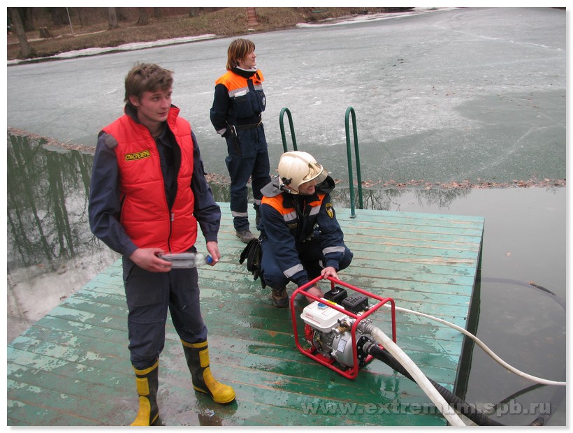 После этого нас отправили на этап "Мотопомпа". Этап чисто развлекательный, просто подержаться за ствол. От нечего делать изобразили скульптурную композицию "ствольщик и подствольщик". Идея устроить коллегам холодный душ почему-то не вызвала в их сердцах горячего отклика, так что пришлось "тушить" пруд.