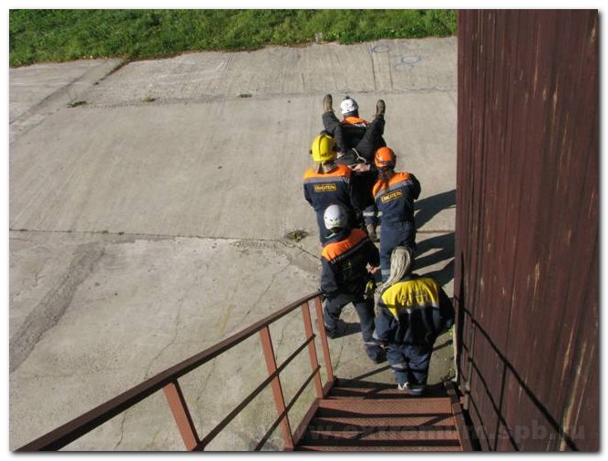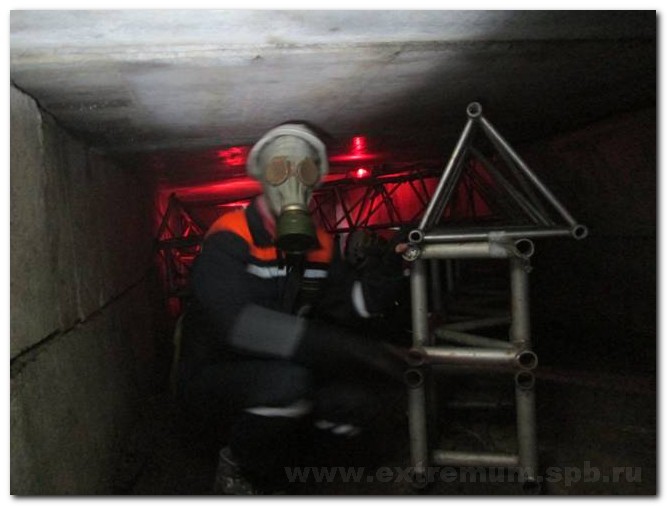 В конструкциях, позволяющих передвигаться только на четвереньках, находится пострадавший (манекен) с раной груди. Необходимо протащить его порядка 20 метров к выходу, сквозь большое количество всякого затрудняющего проход мусора.