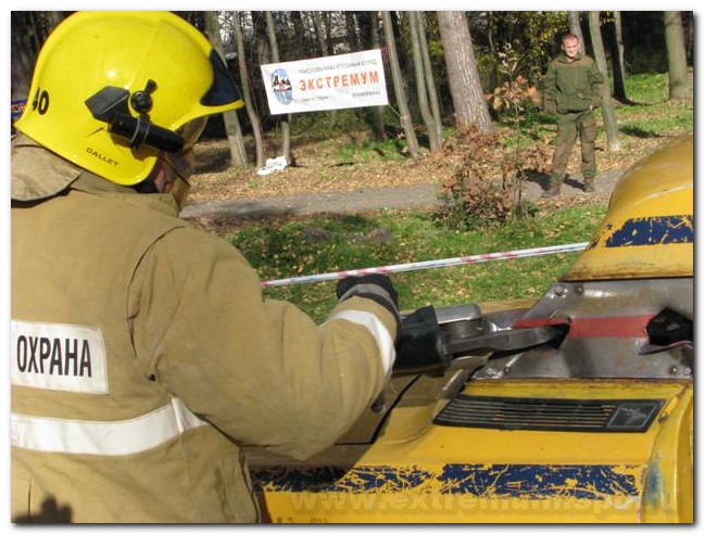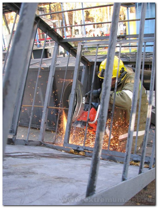 Мы очень просили инструкторов похардкорнее, так что получили, пожалуй, максимум сложности данного этапа (в скобках отмечу, что нас, как питерцев, уже на всех этапах узнавали по нашему желанию "давайте нам потяжелее и посложнее"). Работа гидравлическим разжимом, бензорезом и бензопилой, тушение огня по пути, перетягивание пострадавшего через узкий и захламлённый проход, и всё это в боёвках. |