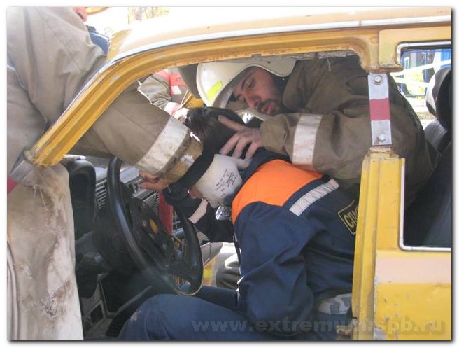 Машина ("Волга"), не деформированная, необходимо вытащить водителя. В целом, проблем не возникло, но были накладки во взаимодействии, вызванные исключительно за счёт отсутствия опыта работы командой на ДТП, ибо знания были видны. И пожалуй, не хватало руководящего работами спасателя, способного охватить взглядом всю сцену и направлять силы на нужные направления.