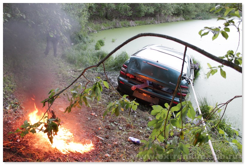 Любое ЧС техногенного характера может сопровождаться и более распространенными авариями — испугавшийся взрыва водитель не справился с управлением и машина съехала в воду. С каждой минутой автомобиль все глубже погружается, и только слаженные действия спасателей позволяют спасти пассажиров от неминуемой гибели.