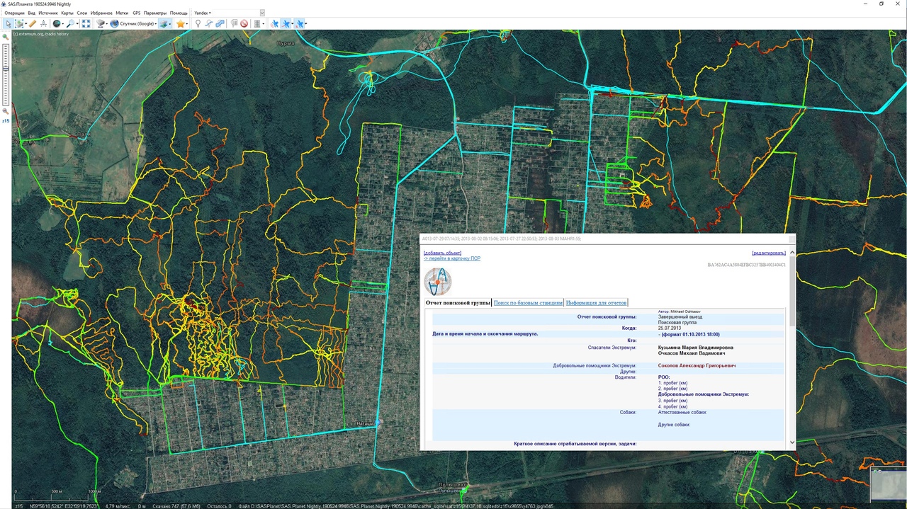 1) Объединили самые крупные базы треков с навигаторов в едином бесплатном инструменте. Это навигационная программа SAS Planet, к которой все могут подключать свои источники данных. Благодаря трекам, которые сдают группы, вернувшиеся с маршрута, мы можем не дублировать проверенные участки, чтобы руководитель поисковых работ мог бросить силы туда, где местность ещё не проверяли.