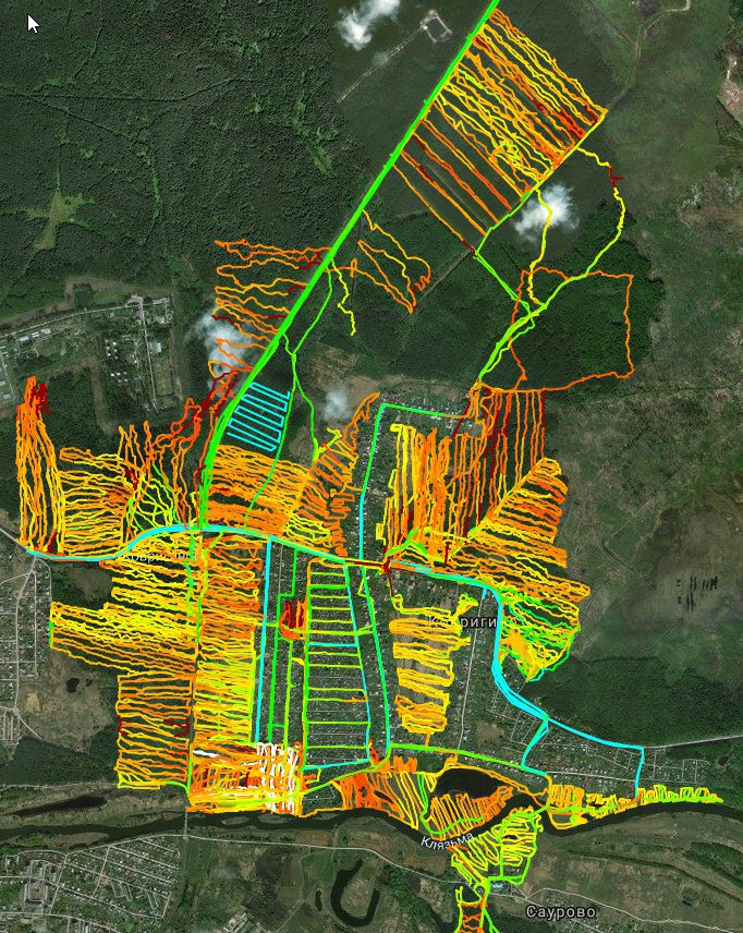 4) Подключили к трекам автоматический анализатор, который убирает откровенно битые данные, а сами треки раскрашивает в зависимости от скорости движения, как, например, отображаются пробки в Яндекс Навигаторе. Теперь руководители спасработ сразу видят, где есть тропинки, а где местность труднопроходима, даже если ничего этого не видно ни на обычных картах, ни на спутниковых снимках.