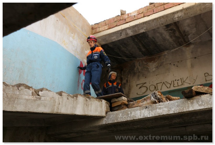 В первый день одним коллегам сильно не повезло - они нашли достаточно много пострадавших, но в тот момент, когда пора было бежать на финиш, одна из собак причуяла еще одного пострадавшего. Кинолог не смог вовремя отозвать собаку, и в результате опоздал. Команда получила ноль за весь этап, несмотря на то, что многих нашла. Зная об этом примере (мы шли на второй день), мы договорились четко следить за временем и лучше выйти чуть раньше, но успеть. Разделили зону на 3 части и пошли работать. Мы с Мухой обыскали свой кусок, нашли там двоих, в точном местоположении одного из которых я немного сомневалась - визуально было непонятно, где именно под полом он находится, а место надо было отметить точно. Оля с Вольтом и Зоя с Ноксом нашли каждая еще по 1 пострадавшему в своих зонах, итого было 4. Т.к. у нас еще оставалось почти половина времени, договорились перепроверить зоны друг за другом. Я указала Оле на здание, где не была точно уверена в месте, и пошла перепроверять чужую зону, минуя те здания, где коллеги уже кого-то нашли. Оля подтвердила, что место нами указано верно. В результате буквально на последних минутах работы Муха нашла еще одного пострадавшего в плитах рядом с одним из зданий. Оно находилось на границе 2х зон, и потому это место частично пропустили при осмотре. Итого у нас было 5 найденных из 6 (как мы позже узнали, еще один находился глубоко тёмном подвале с частично заваленным входом, очень сложная закладка, которую почти никто не нашел).