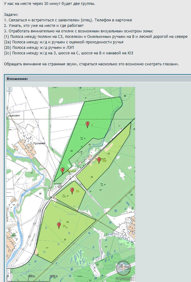 Первая прибывшая группа начинает с вероятного района от машин. Вторая движется на южный край приоритетной зоны, чтобы при работе на отклик не мешать друг-другу. Третья группа в пути.