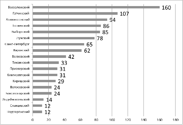Наибольшее количество заявок – Всеволожский район (160 ПСР), Гатчинский район (107), Ломоносовский район (94), Тосненский район (86), Выборгский район (85).