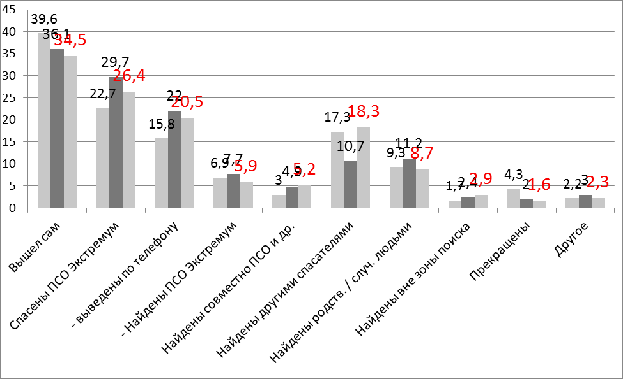 Статистически достоверно, на 8%, увеличилось число найденных другими спасателями (с 10,7% до 18,3%), на 3% снизилось число спасенных ПСО «Экстремум» (с 29,7% до 26,4%).